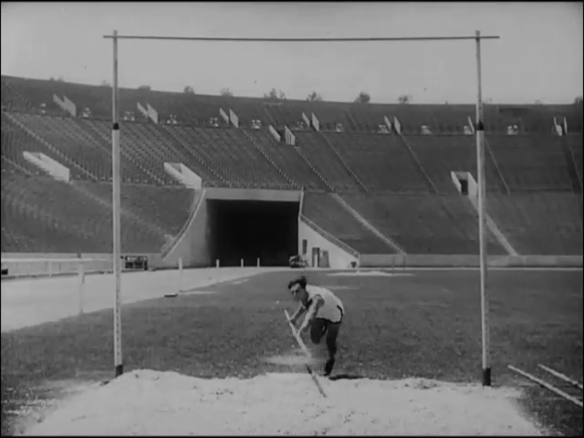 Keaton staged and performed almost all of the stunts in his movies. The professional pole vaulter he used in College was a rare exception. Reportedly, Keaton always regretted that decision. Keaton’s high tolerance for risk extended beyond fearlessness with his own physical safety. By the time College went into production in 1927, the uncontrollable cost overruns of Keaton’s self-directed prior films, especially The General, had created considerable tension between the studio and Keaton. In an attempt to control costs, Keaton’s business manager recommended that James W. Horne be hired as director for College. In a subsequent interview Keaton said that Horne was “absolutely worthless to me… I don’t know why we had him.” Initially Keaton’s role directing College was unacknowledged, but for posterity both men would eventually share credit.